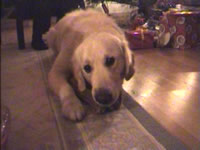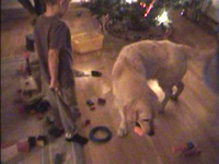 Boston fick mängder av paket från tomten: ben, godis och pipleksaker. Trött av alla nya intryck somnade och sov Boston som en stock. |