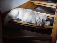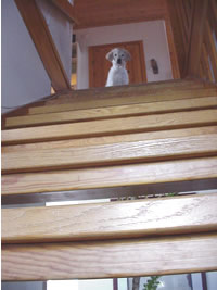 Vi började träna Boston att gå uppför trappan genom att lägga goda köttbullar där. Först på det nedersta trappsteget. Sedan ökade vi svårighetsgraden trappsteg för trappsteg. Tillslut befann han sig högst upp och Boston blev jätteglad att han klarat det.
