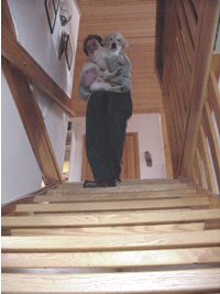 Men väl där uppe vågade han inte ta sig ned själv. Han skällde och skällde på oss. Trots att vi lade ut goda köttbullar i trappan som lockade, så vågade han inte riktigt utan vi fick bära ned honom.